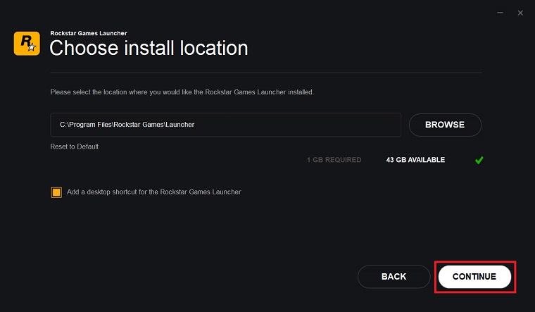 Step 4: Choose the install location for the Rockstar Launcher and click Continue.